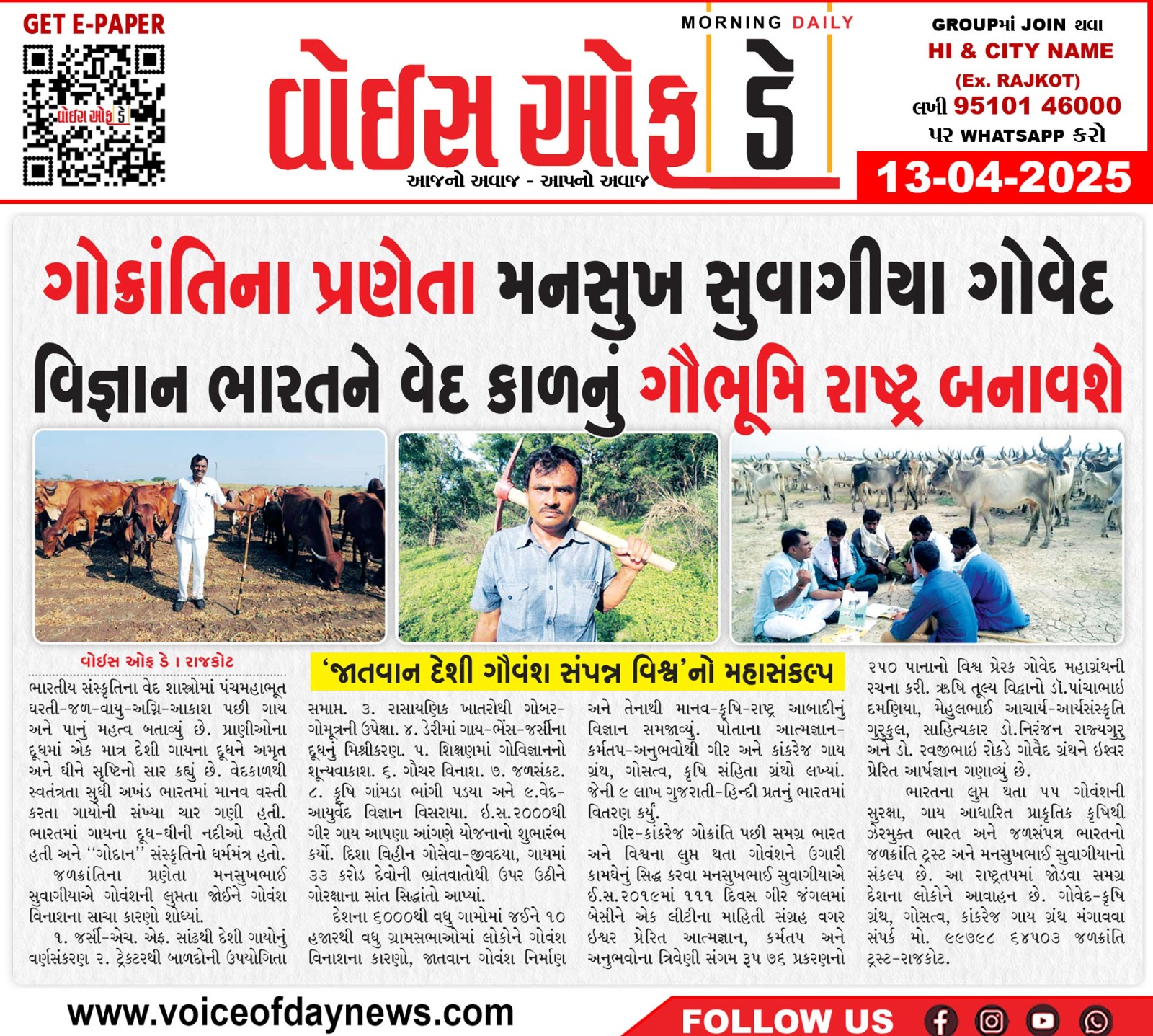 મનસુખભાઈ સુવાગીયા ગોવેદ વિજ્ઞાન ભારતને વેદ કાળનું ગૌભૂમિ રાષ્ટ્ર બનાવશે.
