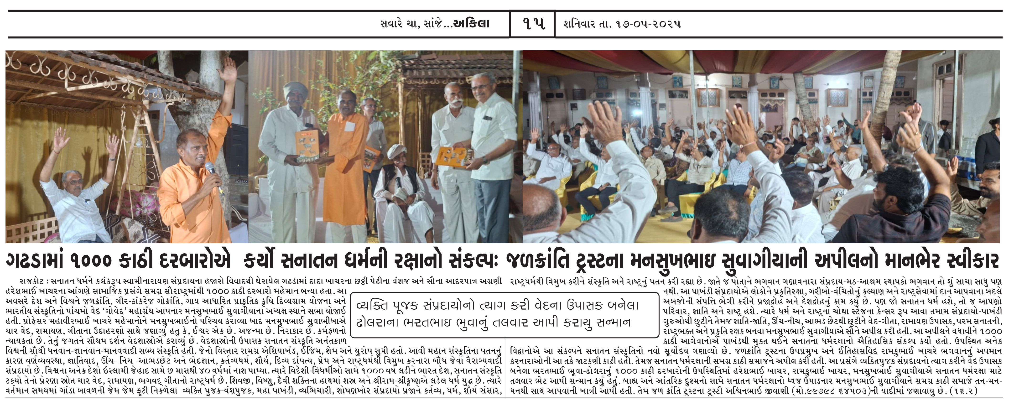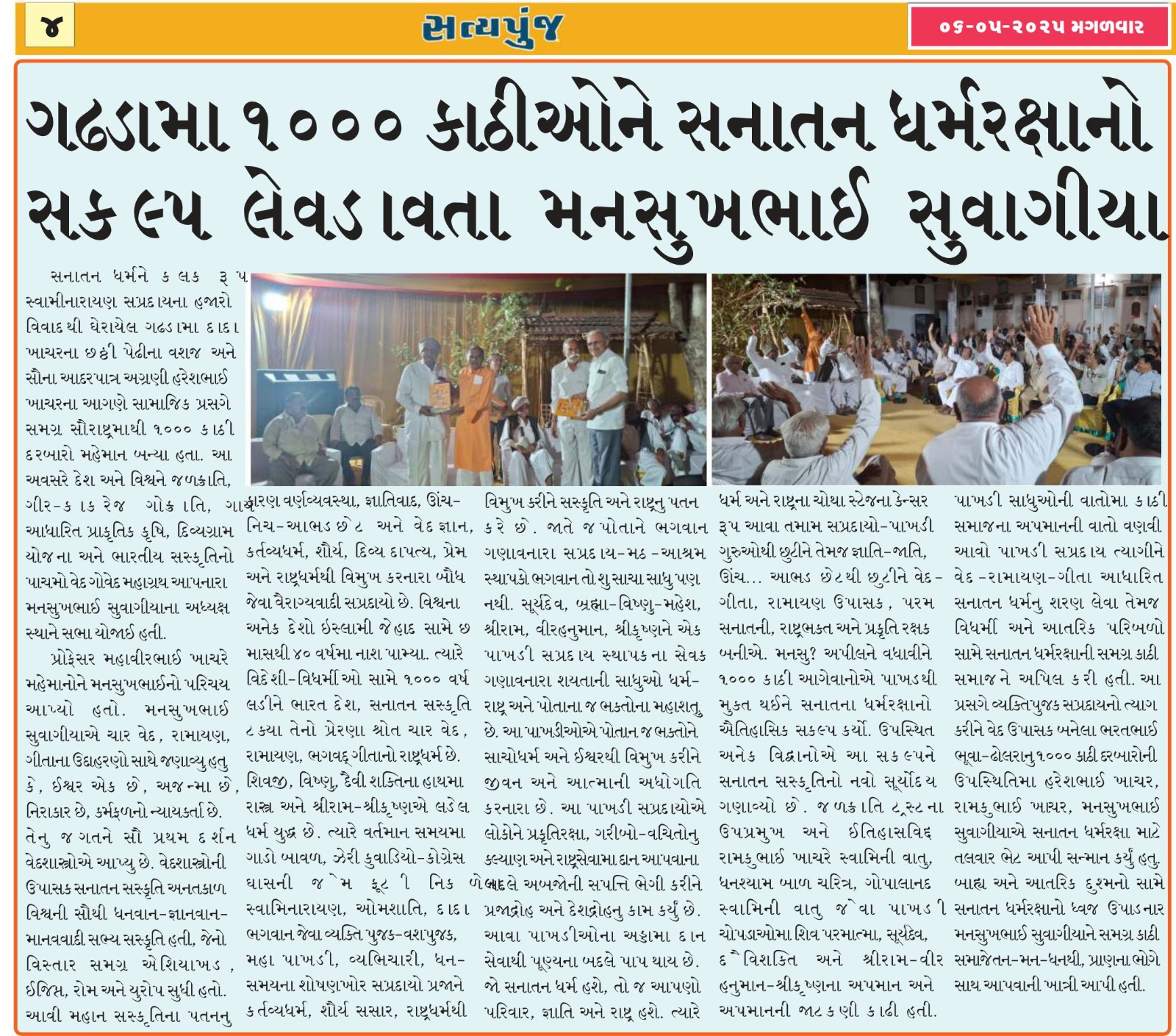 ગઢડા ૧૦૦૦ કાથીઓને સનાતન ધર્મરક્ષાનો સંકલ્પ લેવડાવતા મનસુખભાઈ સુવાગીયા